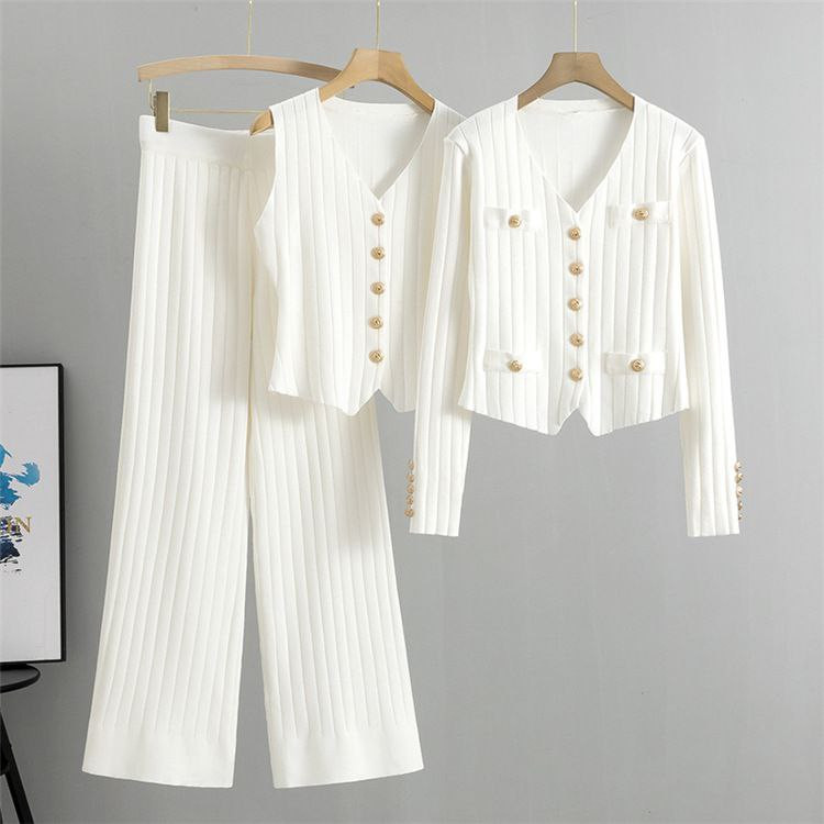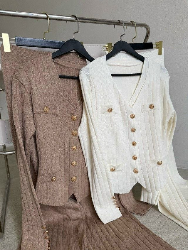 أناقة راقية بلمسة واحدة! هذا الطقم التريكو العصري يجمع بين الشياكة الكلاسيكية والراحة الكاملة، مثالي للمرأة التي تحب إطلالة مرتبة ومميزة.