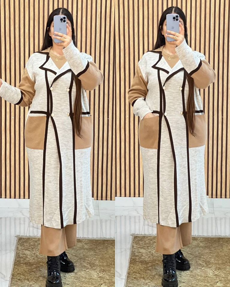 ثلاث قطع كارديغان تريكو طويل بـ Color Block – إطلالة شتوية جريئة وعصري�... -