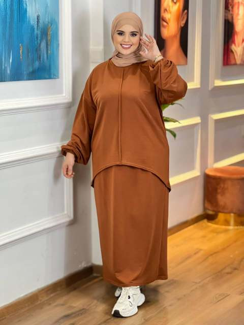 أناقة بسيطة ومحتشمة في طقم واحد! هذا الطقم العصري يجمع بين التوب الأنيق والجيبة الطويلة بتصميم مونطوني راقٍ يناسب المرأة المغربية في يومها اليومي وكل مناسبة.