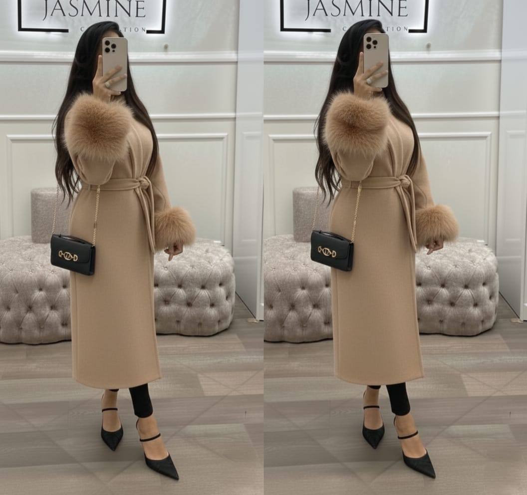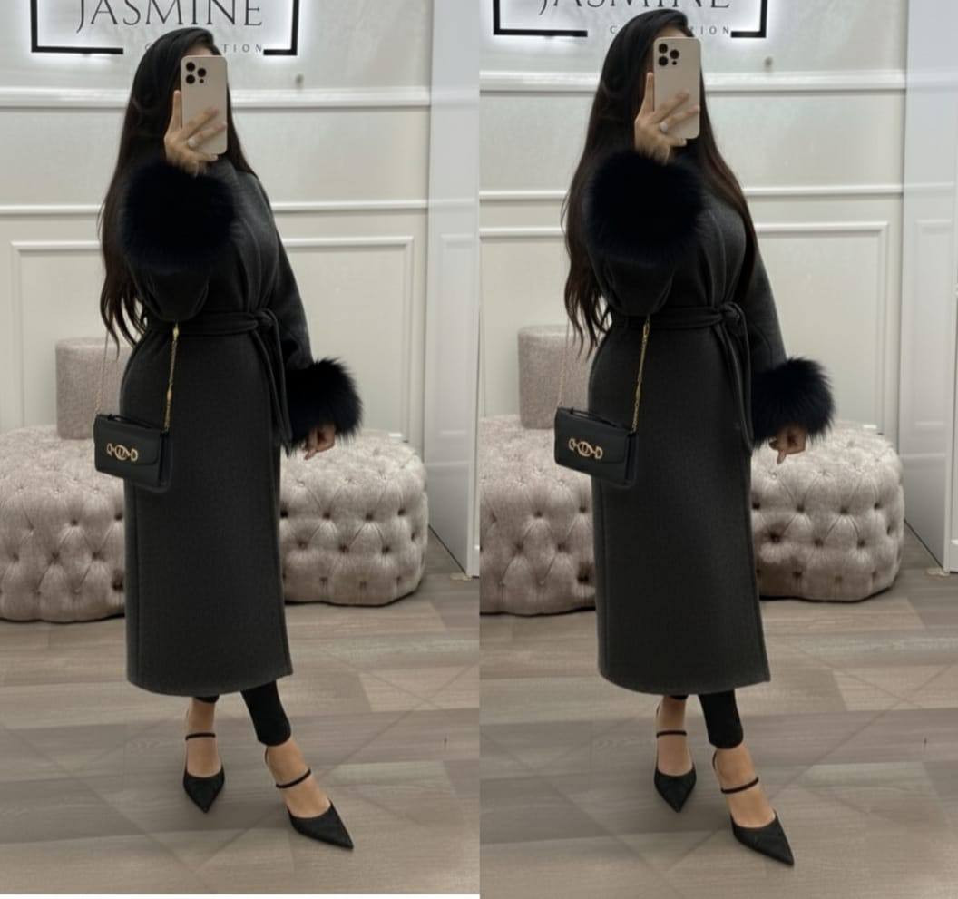 تصميم عصري طويل كيعطيك حضور مميز، مع فورير فاخر فالأكمام كيضيف لمسة فخامة لا تقاوم