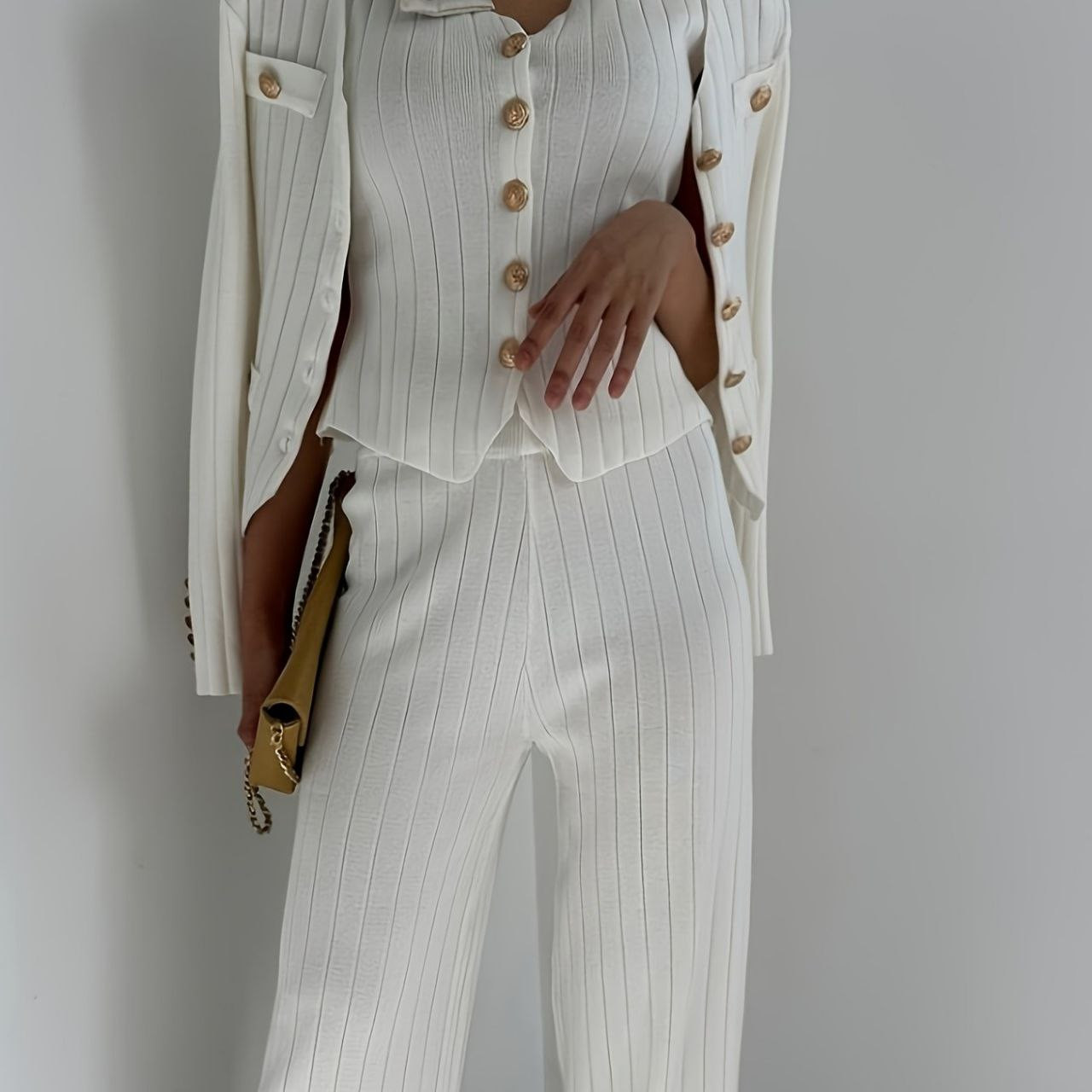أناقة راقية بلمسة واحدة! هذا الطقم التريكو العصري يجمع بين الشياكة الكلاسيكية والراحة الكاملة، مثالي للمرأة التي تحب إطلالة مرتبة ومميزة.