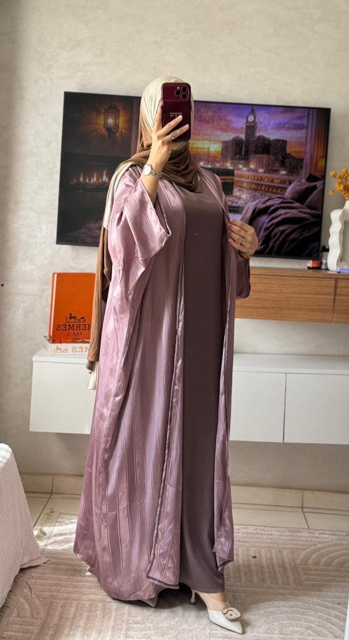 إطلالة تأسر الأنظار! هذه العباية بقطعتين الساتان الحريرية الفاخرة تجمع بين البريق الاستثنائي والراحة التامة، لمن تحب أن تكون مميزة في كل مكان.